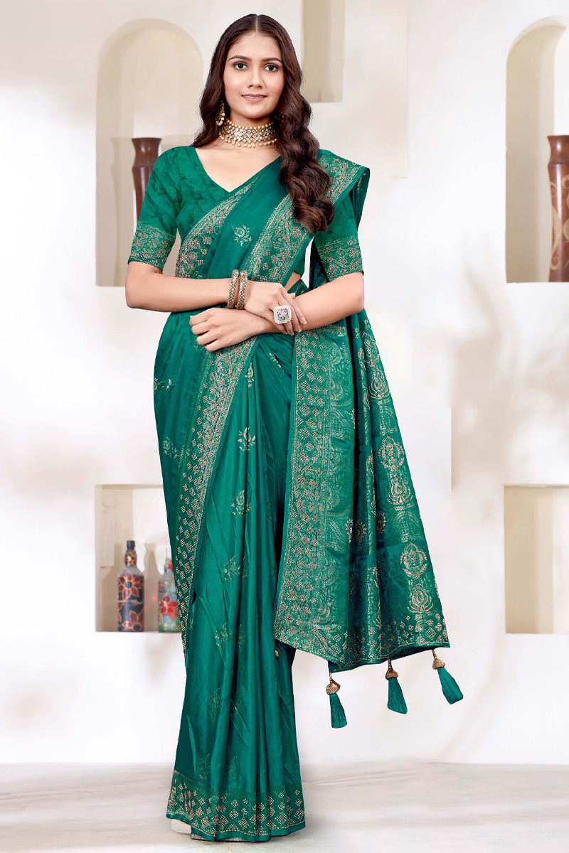 - Designer Silk Saree Stone Work In Green.